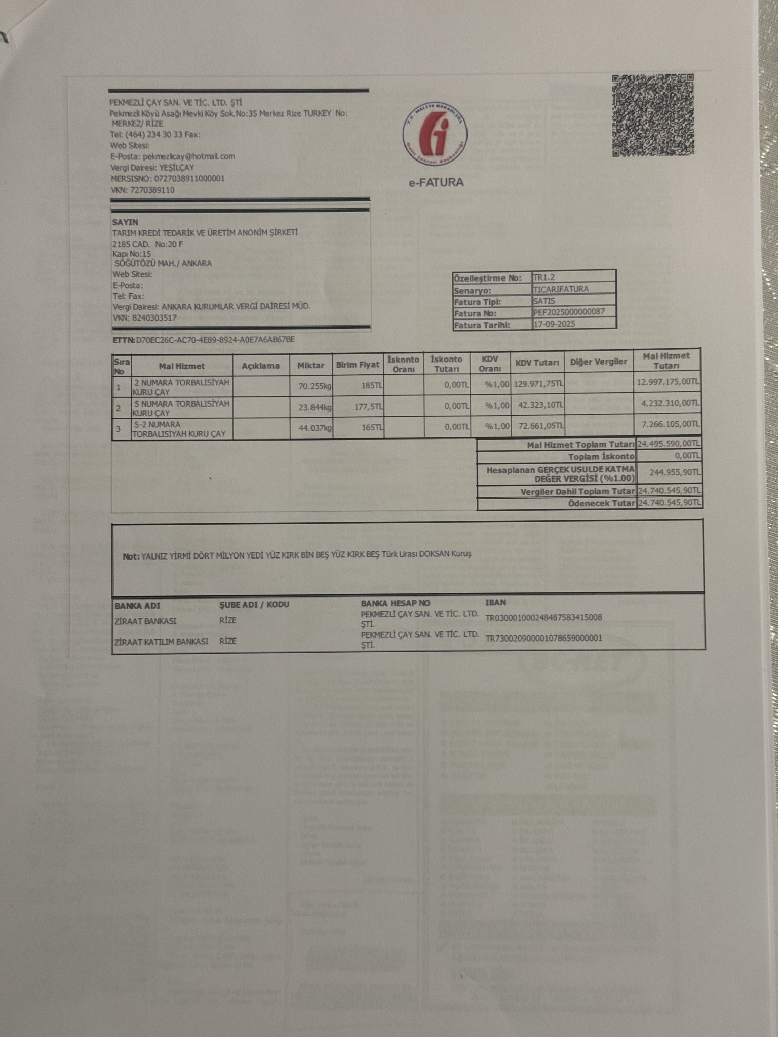 Fatura tutarı: 24 milyon 700 bin TL.
