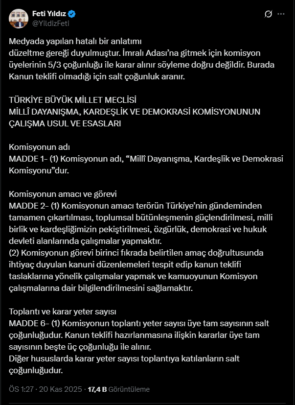 Başka bir paylaşımında Yıldız, Millî Dayanışma, Kardeşlik ve Demokrasi Komisyonu’nun İmralı’ya gitmesi için salt çoğunluğun gerektiğini aktardı. Basında yer alan anlatımın yanlış olduğunu söyleyen Yıldız, komisyon üyelerinin 5’te 3’ünün oyunun gerekmediğini belirtti.