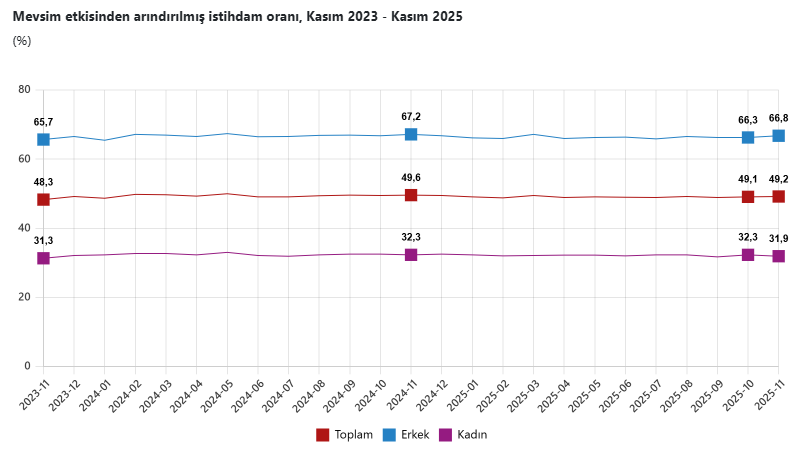 2025 yılı Kasım ayında istihdam edilenlerin sayısı bir önceki aya göre 75 bin kişi artarak 32 milyon 737 bin kişiye ulaştı. İstihdam oranı ise 0,1 puanlık artışla yüzde 49,2 olarak kaydedildi. İstihdam oranı erkeklerde yüzde 66,8, kadınlarda ise yüzde 31,9 olarak gerçekleşti.